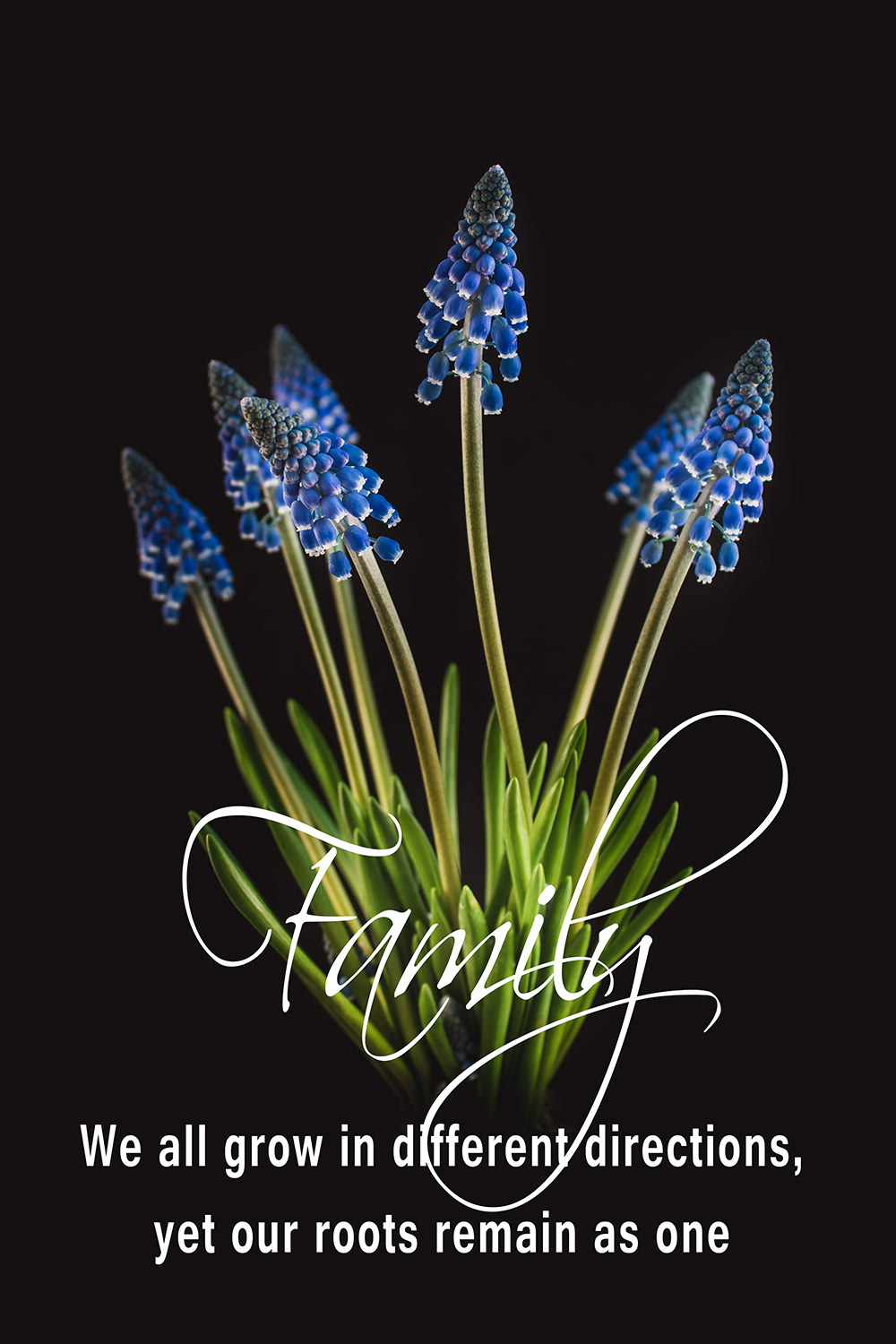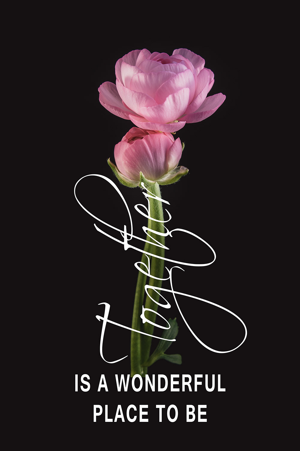 De bloemen worden afzonderlijk gefotografeerd en zorgvuldig bewerkt om kleur, licht en detail optimaal vast te leggen. Vervolgens wordt de compositie opgebouwd, waarbij de plaatsing van de tekst met aandacht wordt afgestemd op het beeld. Elk element krijgt ruimte, zodat er een natuurlijke balans ontstaat tussen fotografie en typografie.